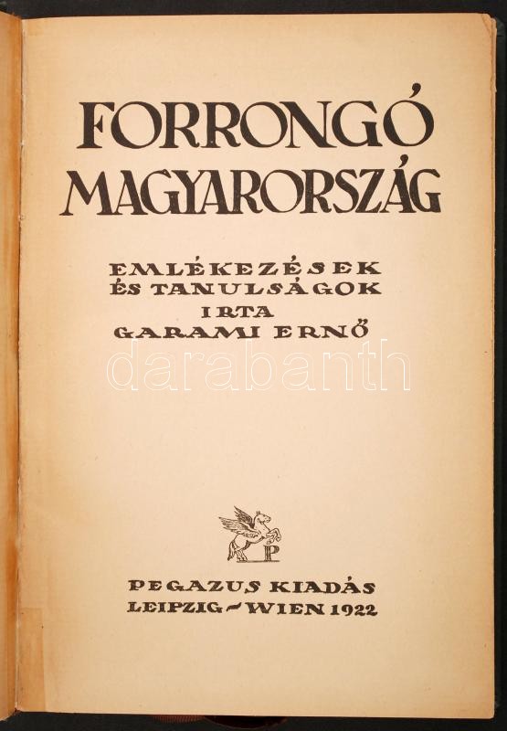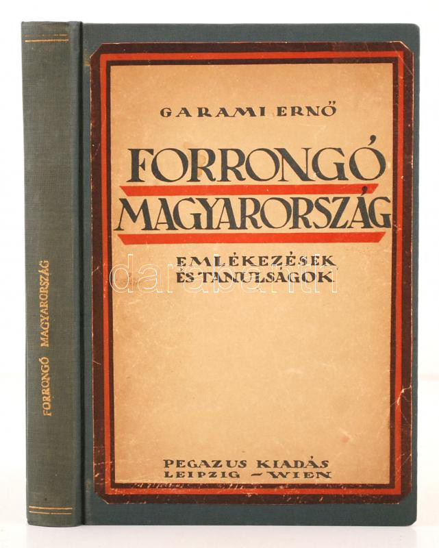 Garami Ernő: Forrongó Magyarország. Emlékezések és tanulságok. Bécs, 1922. Pegazus. 243 p. A címlapokat és az ajánlást Biró Mihály rajzolta. Korabeli egészvászon-kötésben, az eredeti borító felragasztva.