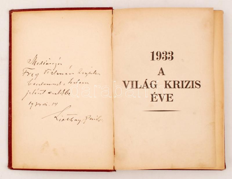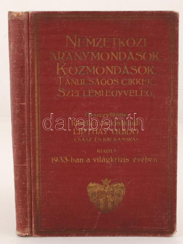 Nemzetközi aranymondások. Közmondások. Tanulságos cikkek. Szellemi egyveleg. Összegyűjtötte: lubellei és kisfaludi Lipthay Guido csázs. királyi kamarás. DEDIKÁLT! Kiadta 1933-ban a világkrízis évében. Kiadói aranyozott egészvászon kötés, kopottas állapotban.
