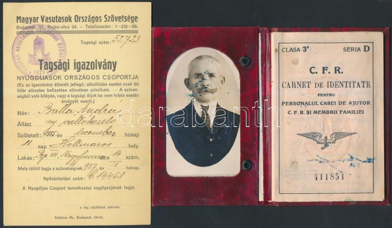 Beschreibung: 1935, 1937 A Magyar Vasutasok Országos Szövetsége által kiadott tagsági igazolvány és egy román vasúti igazolvány
