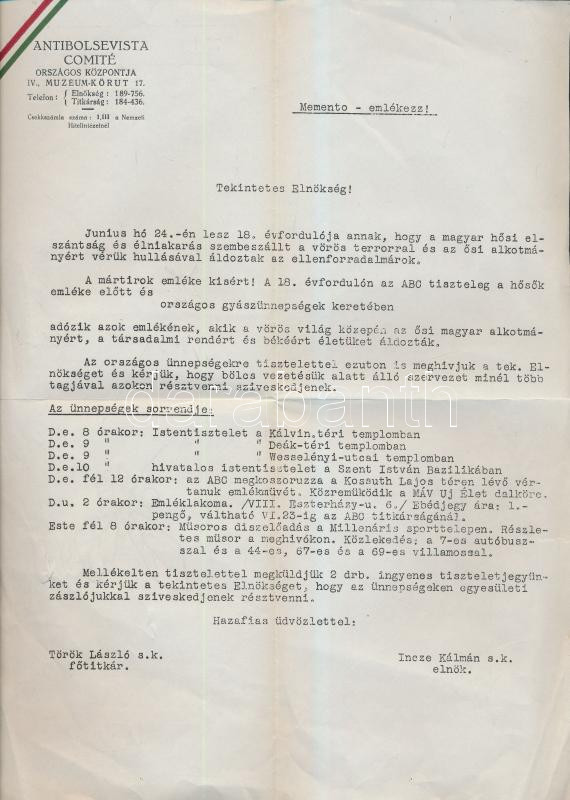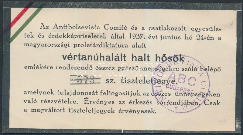 1937 az Antibolsevista Comité géppel írt meghívó levele azonosítatlan egyesület elnökségének a Tanácsköztársaság áldozatainak emlékére rendezett ünnepség alkalmából, hozzá tartozó 1 db érvényesített, számozott tiszteletjeggyel