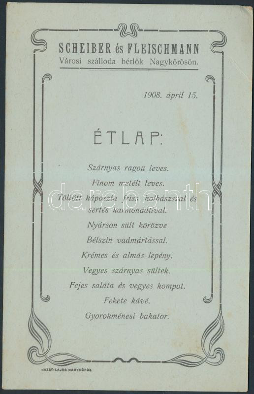 1908 Nagykőrös, Scheiber és Fleischmann Városi Szálloda Bérlők étlapja https://www.darabanth.com/de/254-Fernauktion/254.0/Andere-Sammelgebiete/Drucksachen~400010/1908-Nagykoros-Scheiber-es-Fleischmann-Varosi-Szalloda-Berlok-etlapja~II1235128