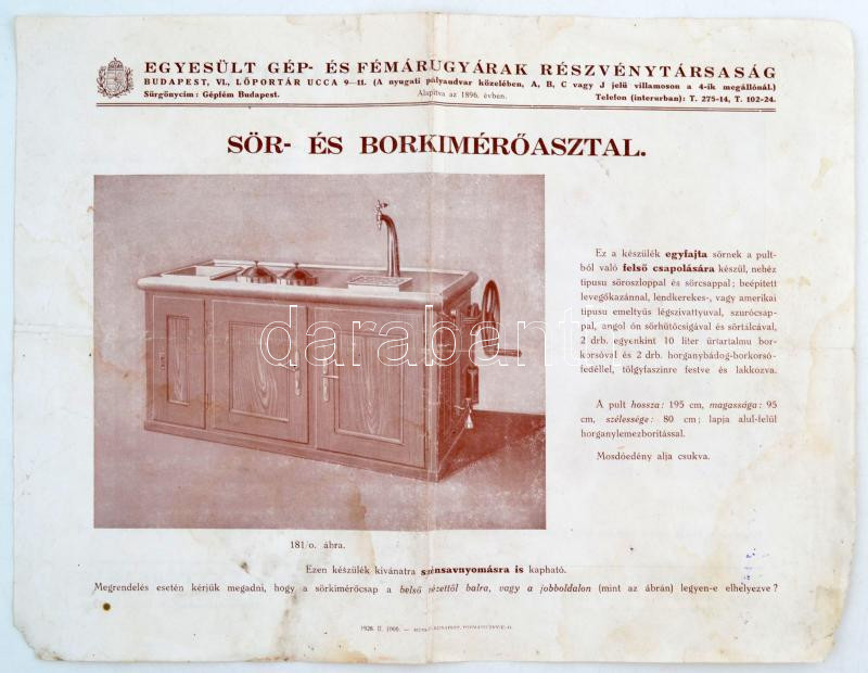 Beschreibung: 1928 Bp.VI., Az Egyesült Gép- és Fémárugyárak Részvénytársaság sör- és borkimérő asztala, kétoldalas szórólap