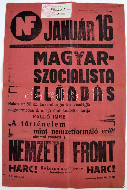 1936 A Nemzeti Front magyar szocialista előadást hirdető nagyméretű pl... https://www.darabanth.com/de/254-Fernauktion/254.0/Andere-Sammelgebiete/Drucksachen~400010/1936-A-Nemzeti-Front-magyar-szocialista-eloadast-hirdeto-nagymeretu-plakatja-48x32-cm~II1239158
