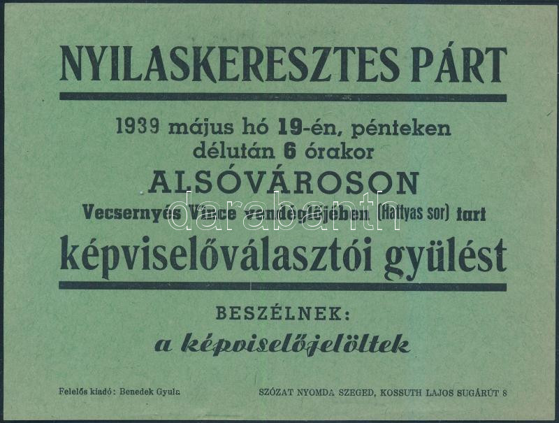 1939 A Nyilaskeresztes Párt képviselőválasztói gyűlését hirdető szóról... https://www.darabanth.com/de/254-Fernauktion/254.0/Andere-Sammelgebiete/Drucksachen~400010/1939-A-Nyilaskeresztes-Part-kepviselovalasztoi-gyuleset-hirdeto-szorolap-12x15-cm~II1235165
