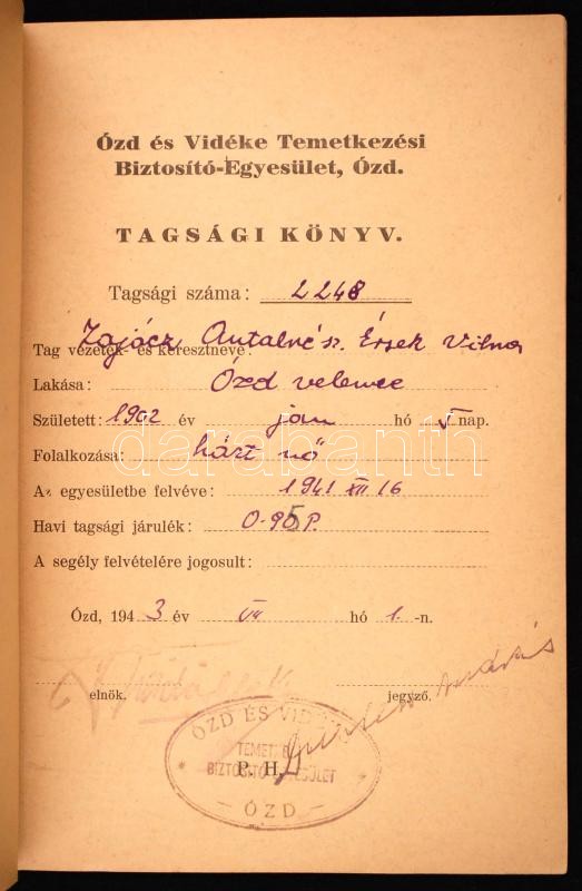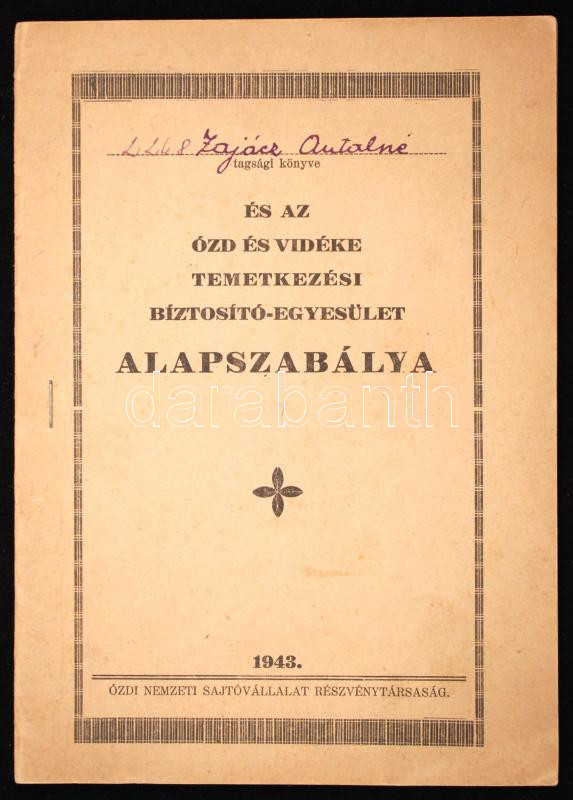 1943 Tagsági könyv és az Ózd és vidéke temetkezési biztosító-egyesület... https://www.darabanth.com/de/254-Fernauktion/254.0/Andere-Sammelgebiete/Drucksachen~400010/1943-Tagsagi-konyv-es-az-Ozd-es-videke-temetkezesi-biztosito-egyesulet-alapszabalya-bely~II1235506