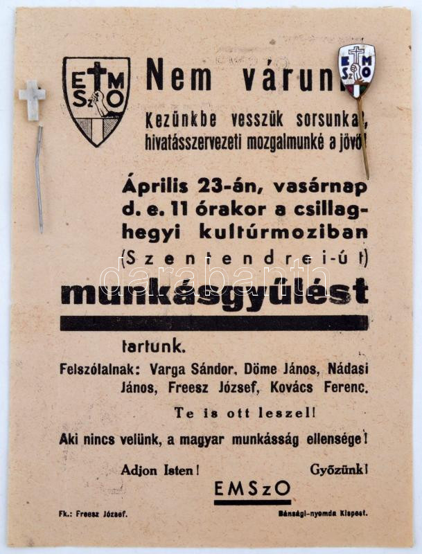 Beschreibung: cca 1930-1940 EMSzO (Egyházközségi Munkásszakosztályok) munkásgyűlésre felhívó kisméretű szórólapja, rajta jelvényekkel