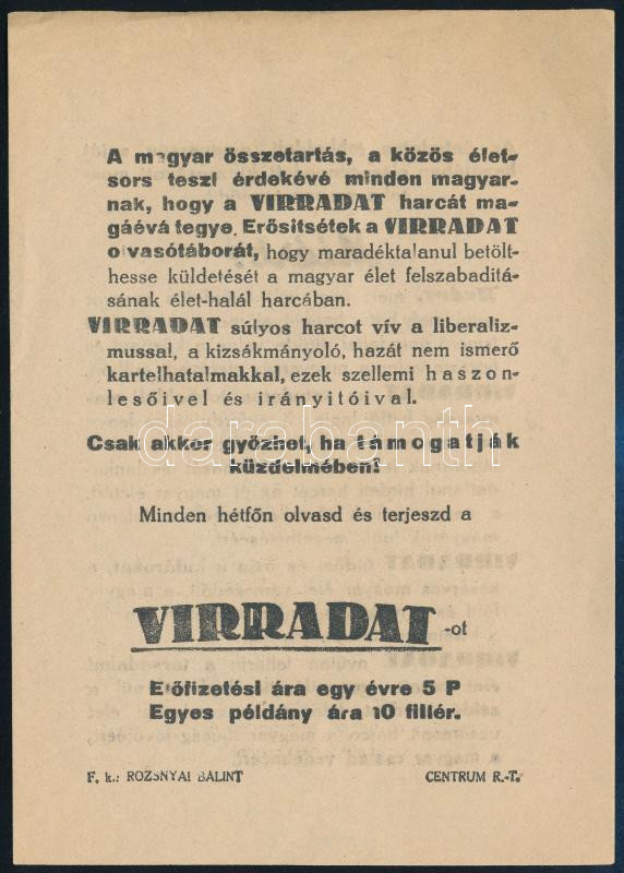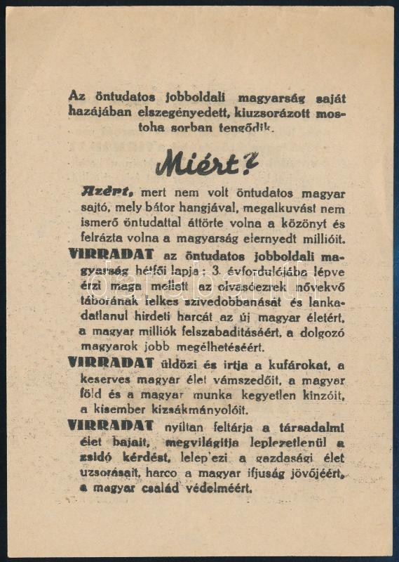cca 1935-1936 A Virradat, "az öntudatos jobboldali magyar sajtó" megje... https://www.darabanth.com/de/254-Fernauktion/254.0/Andere-Sammelgebiete/Drucksachen~400010/cca-1935-1936-A-Virradat-az-ontudatos-jobboldali-magyar-sajto-megjeleneset-hirdeto-kismeret~II1239250