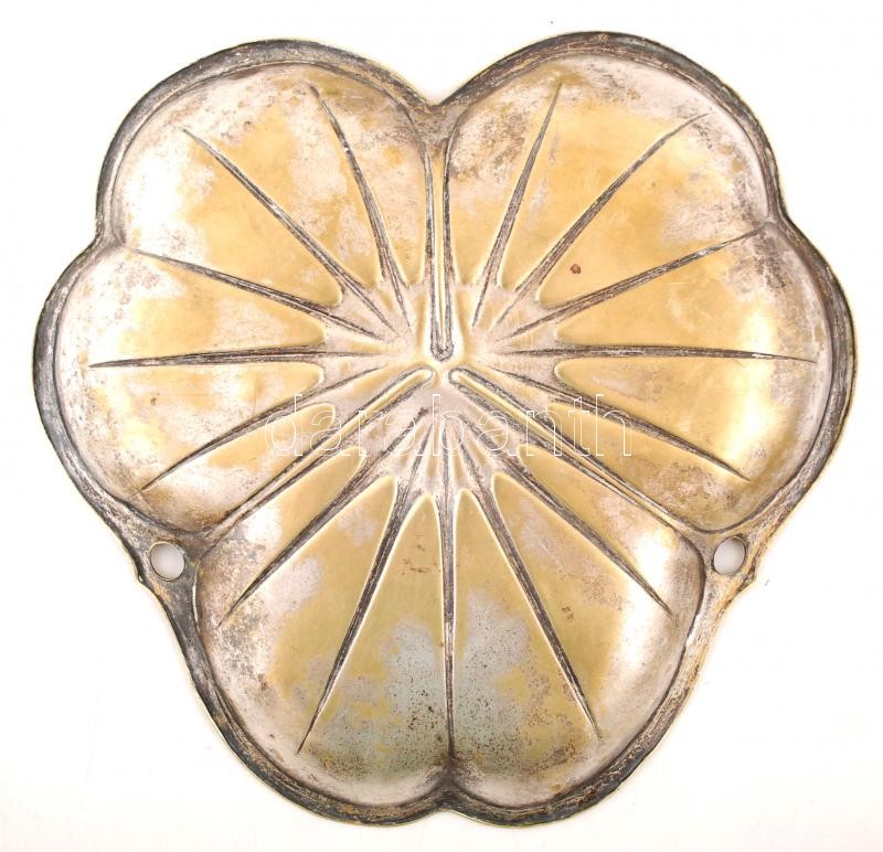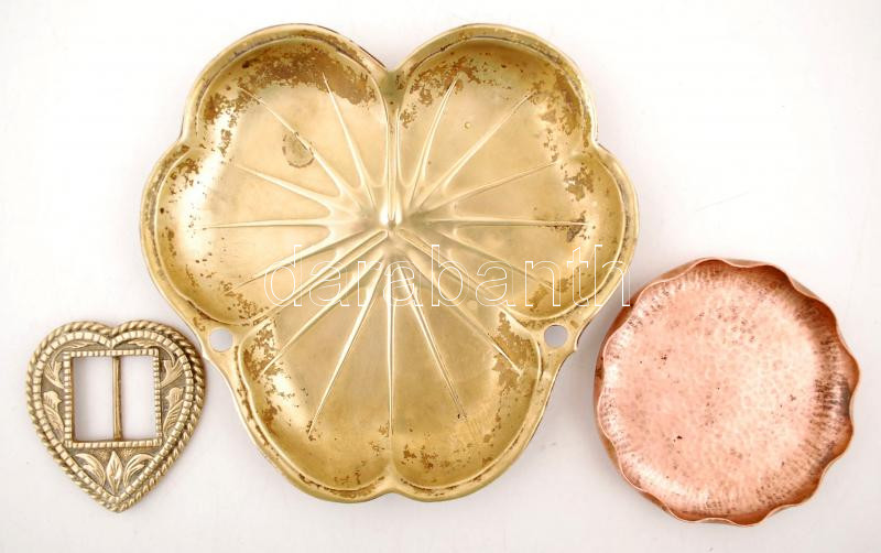Beschreibung: 3 db különféle réztárgy: 1 db gazdagon díszített, szív alakú fényképtartó, 2 db dekoratív tálca, különböző méretben
