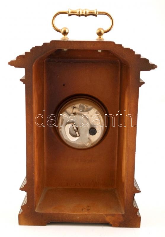 Beschreibung: Dekoratív asztali óra, fa, réz rátétekkel, az óraszerkezet részben működik, de nem jár, 16×10,5×26,5 cm