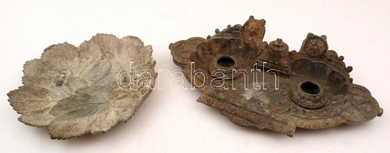 Beschreibung: Gazdagon díszített asztali fém tintatartó, 37×23,5 cm + levél alakú díszes fém kínáló, 25×23,5 cm