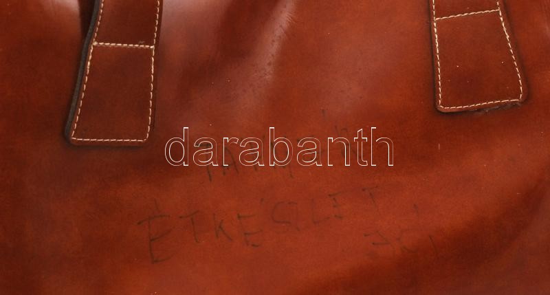 Beschreibung: Nagyméretű műbőr utazótáska, zipzárral, az egyik oldalán kopott felirattal, egyébként jó állapotban, cca 52×35×37 cm