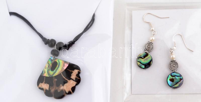 Beschreibung: Pauau kagyló elemekkel díszített mutatós fülbevalópár hozzáillő medálos nyaklánccal