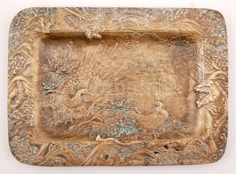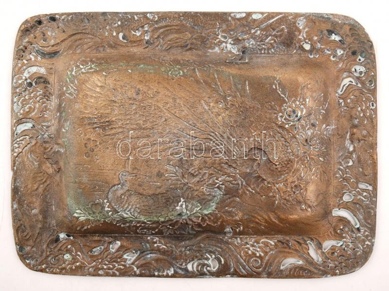 Beschreibung: Pávamotívumos, gazdagon díszített bronz tálca, jelzés nélkül, kis kopásnyomokkal, áttörésekkel, 22,5×16 cm