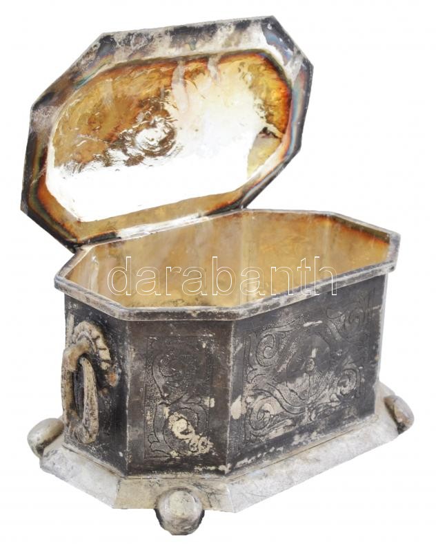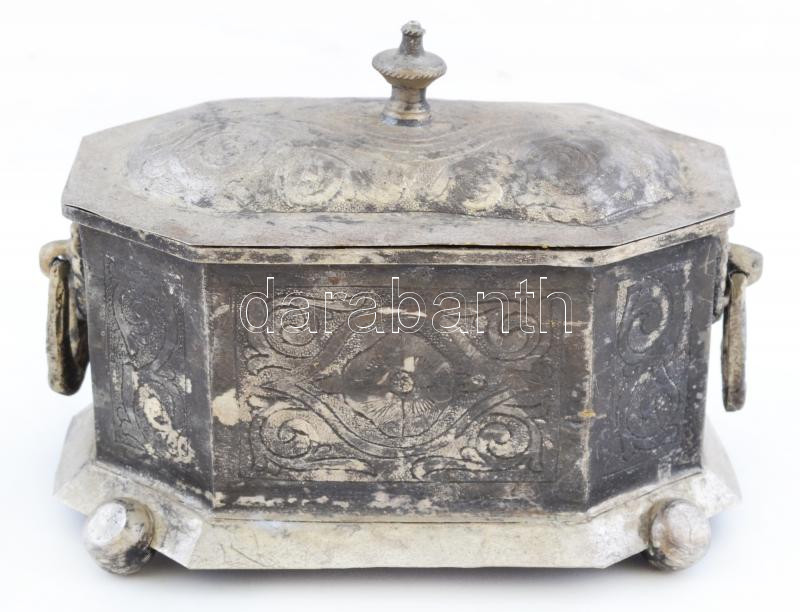 Beschreibung: Régi, díszes cukortartó, fém, jelzett, 8x14x9cm