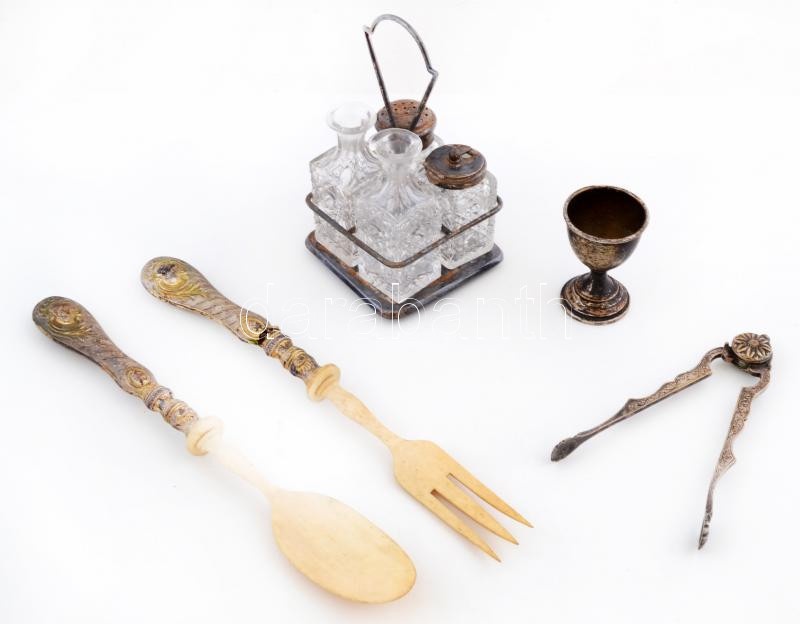 Vegyes régi konyhai eszköz tétel: ezüstözött cukorfogó, jelzett + fém tojástartó + fémnyelű csont kanál és villa, az egyik sérült + üveg só- és borsszóró és 2 db olajos üvegcse, fém tartóban