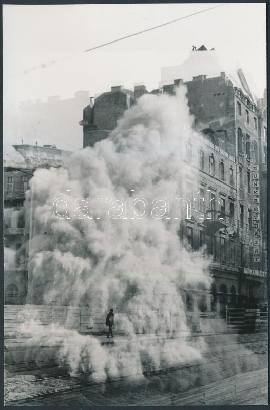 1973 Budapest, különleges fénykép, a Kálvin tér mögött levő Névtelen utcában robbantással bontottak egy házat, a robbanás porfelhőjében sértetlen gyalogos látható, Karai Sándor kétszer exponált ugyanarra a negatívra, szóval ez egy dupla expozíciós negatív montázs, pecséttel jelzett, 14x9 cm