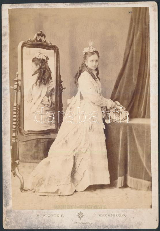 Beschreibung: cca 1870 E. Kozics pozsonyi műtermében készült tükrös kabinetfotó az eladósorban levő leánykáról, 16x11 cm