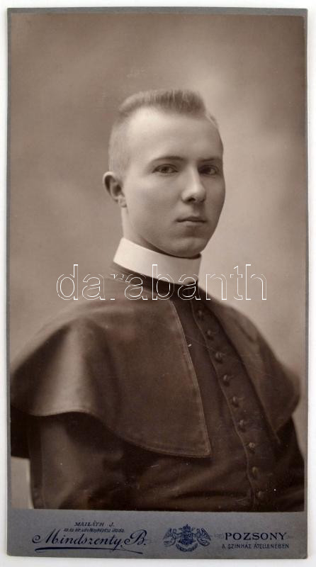 Beschreibung: cca 1907 Toma Imre (1884-1946) plébános, tábori lelkész, későbbi esperes portréja, nagyméretű keményhátú fotó Mindszenty pozsonyi műterméből, 21×11,5 cm