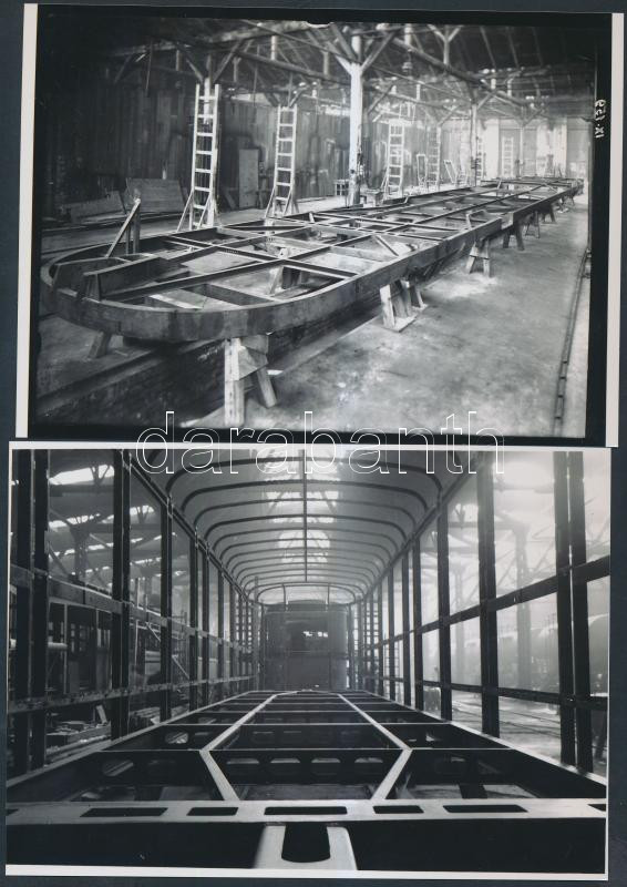 cca 1933 Árpád gyorssínautóbusz épül a Ganz gyárban, 3 db műhely fotó + a tervrajzról készült fotókópia + Ganz Ábrahám műtermi felvétele, 5 db korabeli negatívról készült modern nagyítás, 13x8 cm és 13x18 cm