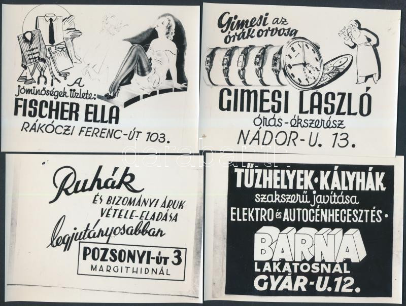 cca 1940 Fekete György (1904-1990) budapesti fényképész specialitása a mozikban nagyfilmek előtt vetített álló diapozitív reklámképek voltak, ez az összeállítás a diák elkészítéséhez szükséges grafikákról, feliratokról készült 13 db papírképet tartalmazza, korabeli negatívokról későbbi nagyítások, 9x12 cm és 9x14 cm
