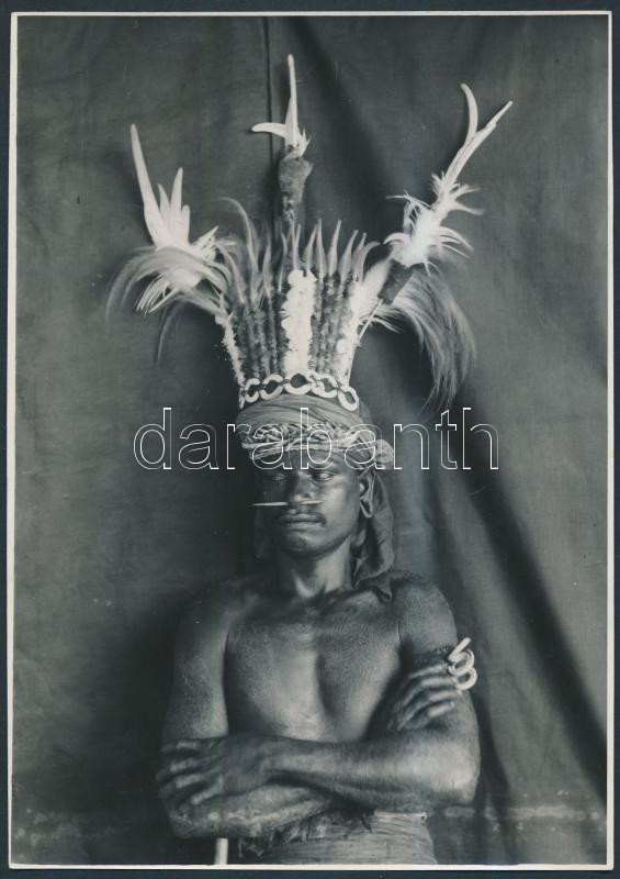 cca 1960 Új Guniea, Huon-öböl, jabim legény ünnepi díszben, néprajzi fotó az Élet és Tudomány c. lap pecsétjével, feliratozva, 18x12,5 cm / cca 1960 Huon Gulf, Papua New Guinea, jabim man, vintage photo, 18x12,5 cm