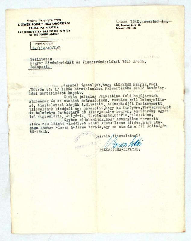 Beschreibung: 1940 Palesztínába kivándorló magyar zsidó okmánya a Palesztin hivataltól.