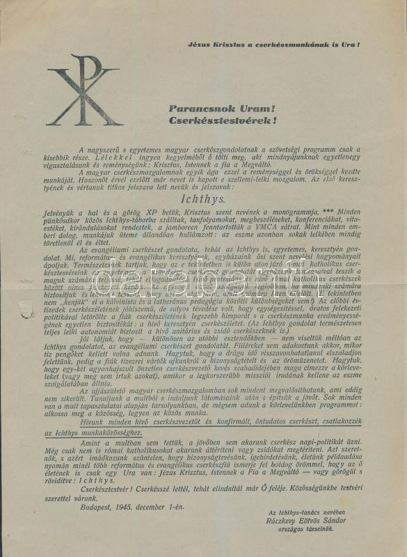 1945 Bp., Az Ichthys-tanács nevében az evangéliumi cserkészetről kiado... https://www.darabanth.com/de/254-Fernauktion/254.0/Andere-Sammelgebiete/Pfadfinder~400002/1945-Bp-Az-Ichthys-tanacs-neveben-az-evangeliumi-cserkeszetrol-kiadott-korlevel~II1235192