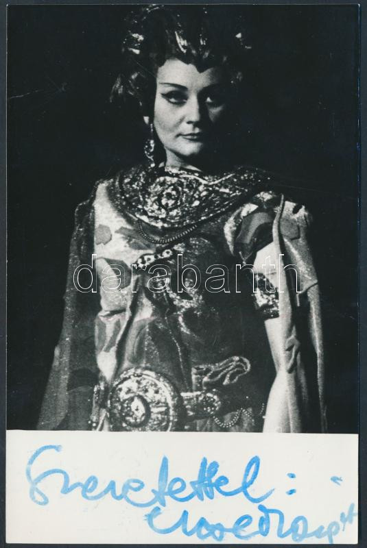 Beschreibung: Ercse Margit (1943--) mezzoszoprán saját kezű aláírása egy a művésznőt ábrázoló Mezei Béla által jelzett fotón, 14x9cm