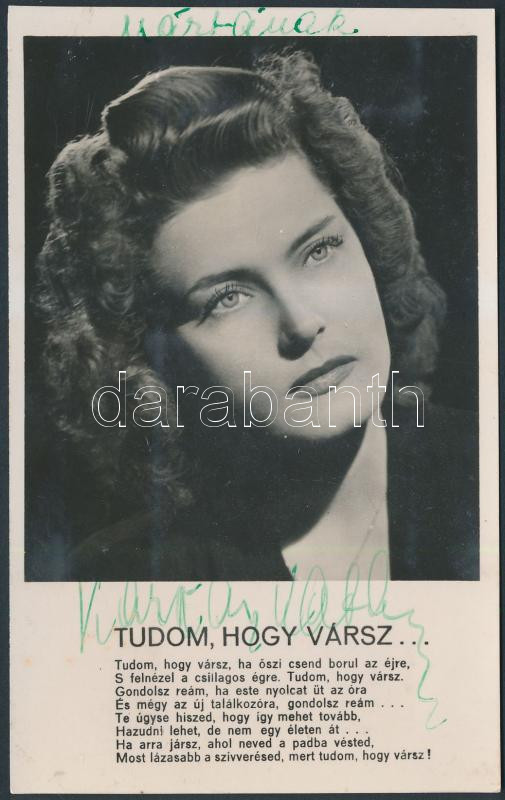 Beschreibung: Karády Katalin (1910-1990) színésznő, énekes aláírása őt magát ábrázoló fotólapon