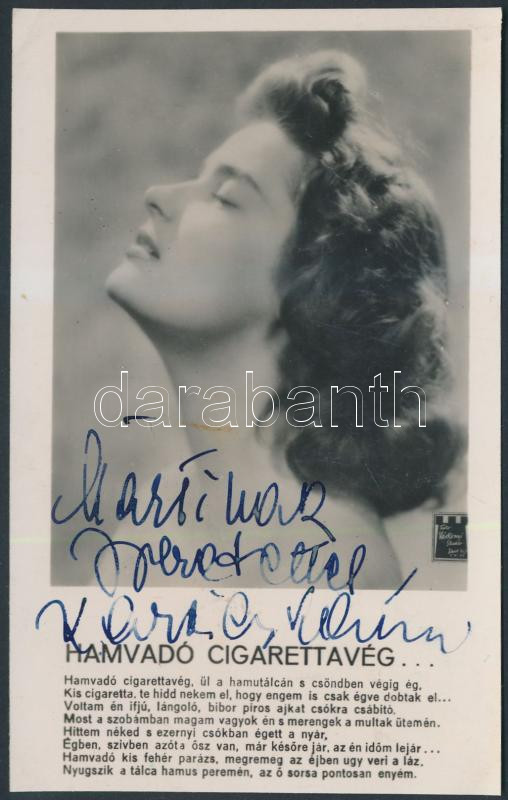 Beschreibung: Karády Katalin (1910-1990) színésznő, énekes aláírása őt magát ábrázoló fotólapon