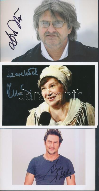 Vegyes saját kezű aláírás tétel fotón, nyomtatványon, 3db: Árpa Attila (1971-) színész, producer, gyártásvezető, forgatókönyvíró; Dörner György (1953-)színművész, szinkronszínész; Zsurzs Kati (1955-) színésznő, szinkronszínésznő. Szép állapotban, cca 15x10cm
