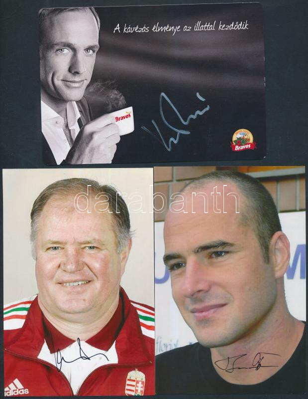 Vegyes saját kezű aláírás tétel fotón, nyomtatványon, 3db: Kásás Tamás (1976-) háromszoros olimpiai bajnok vízilabdázó; Benedek Tibor (1972-) háromszoros olimpiai bajnok, Európa- és világbajnok vízilabdázó, edző; Kemény Dénes (1954) válogatott vízilabdázó, edző. Szép állapotban, cca 15x10cm