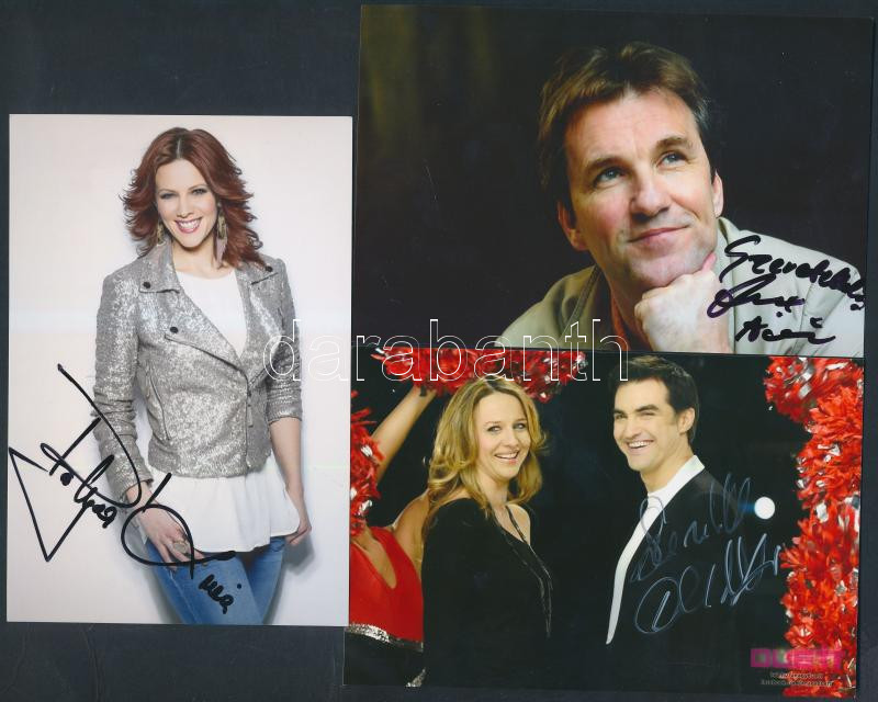 Vegyes saját kezű aláírás tétel fotón, nyomtatványon, 3db: Polyák Lilla (1976-) énekesnő, színésznő; Dolhai Attila (1977-) színész, musicalénekes; Lux Ádám (1964-) színész, szinkronszínész. Szép állapotban, cca 15x10cm