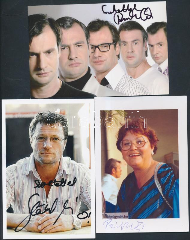 Vegyes saját kezű aláírás tétel fotón, nyomtatványon, 3db: Stohl András (1967-) színművész, televíziós műsorvezető; Pindroch Csaba (1972-) színművész; Pécsi Ildikó (1940-)színművésznő, rendező. Szép állapotban,cca 15x10cm