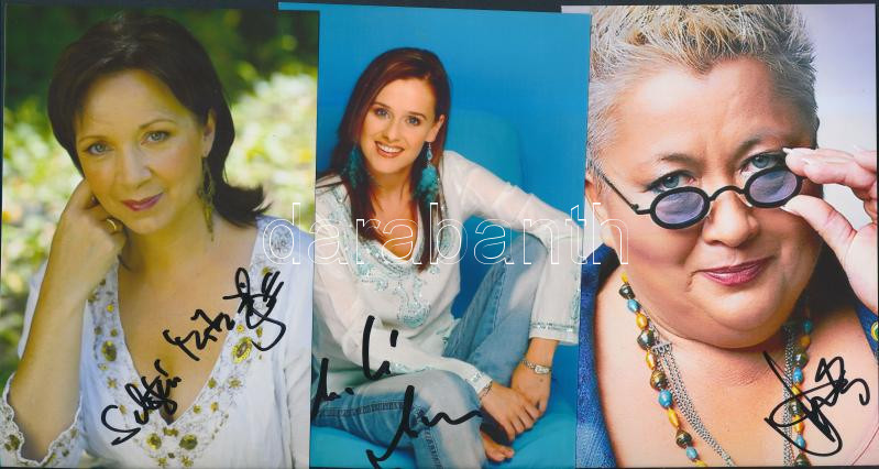 Vegyes saját kezű aláírás tétel fotón, nyomtatványon, 3db:Falusi Mariann (1959-) énekes, rádiós- és televíziós műsorvezető, színésznő, a Pa-Dö-Dő együttes tagja; Mahó Andrea (1979-) színésznő, énekesnő, szinkronszínésznő; Sebestyén Márta (1957-) népdalénekes, előadóművész. Szép állapotban,cca 15x10cm
