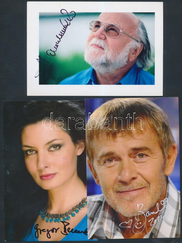 Beschreibung: Vegyes saját kezű aláírás tétel fotón, nyomtatványon, 3db:Gregor Bernadett (1972-) színésznő, popénekes; Nagy Bandó András(1947-) humorista, előadóművész, író; Haumann Péter (1941-) színművész, rendező. Szép állapotban,cca 15x10cm