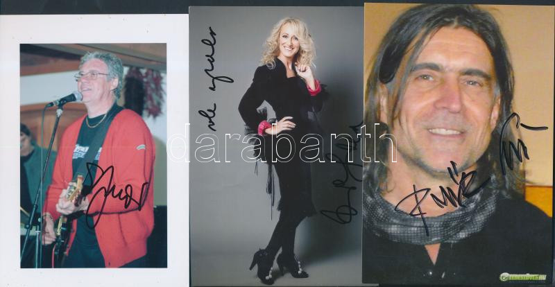 Vegyes saját kezű aláírás tétel fotón, nyomtatványon, 3db:Révész Sándor (1953-) énekes, a Generál és a Piramis együttesek énekese; Vincze Lilla (1961-) énekesnő, szövegíró; Sólyom Tamás (?-) zenész. Szép állapotban, cca 15x10cm