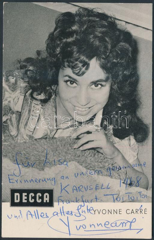 Yvonne Carré énekes saját kezű aláírása egy a művésznőt ábrázoló nyom... https://www.darabanth.com/de/254-Fernauktion/254.0/Andere-Sammelgebiete/Signatur~400030/Yvonne-Carre-enekes-sajat-kezu-alairasa-egy-a-muvesznot-abrazolo-nyomtatvanyon-14x9c~II1217248