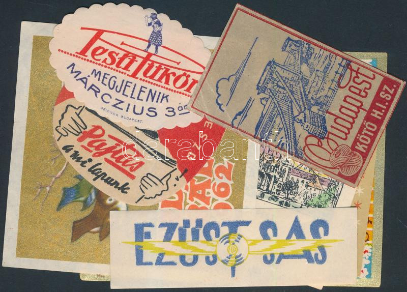 Beschreibung: 8 db vegyes magyar címke: Erdész Bál 1962, Ezüst Sas, Testi Tükör, Budapest Kötő HISz, Méz, Pajtás, stb., különböző méretben