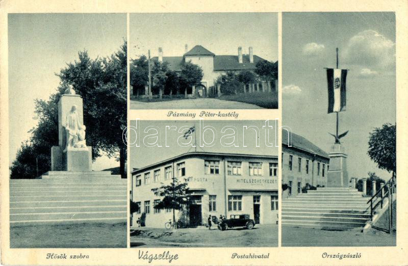 Vágsellye, Pázmány Péter kastélya, posta, hősök szobra, országzászló; Kollmann Jakab kiadása / multi-view with national flag, post office and military monument
