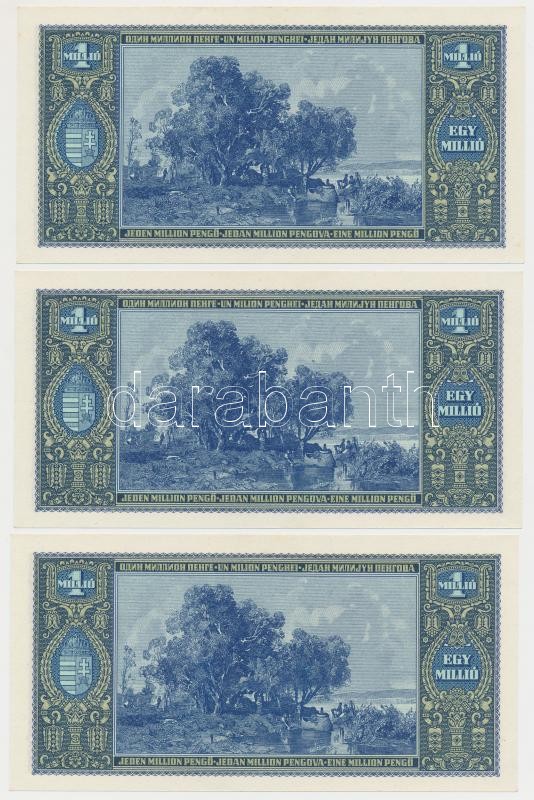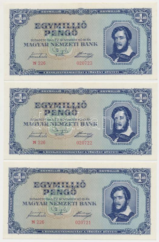 1945. 1.000.000P (3x) sorszámkövetők T:I https://www.darabanth.com/de/254-Fernauktion/254.0/Numismatik/Ungarische-Banknoten~8/1945-1000000P-3x-sorszamkovetok-TI~II1233878