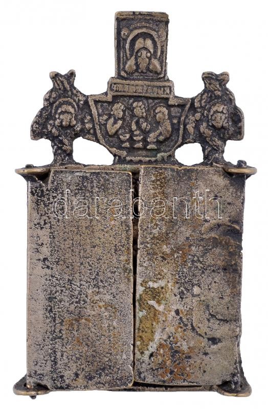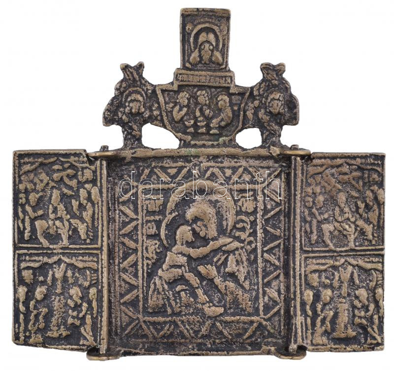 19. sz., Szűz Mária a kis Jézussal, antik, triptychon formátumú orosz utazó ikon, bronz, jelzés nélkül, 9×9,5 cm (kinyitva), 9×5,5 cm (becsukva) / 19th century, Virgin Mary with baby Jesus, antique Russian traveler's icon in triptych form, bronze, without hallmark, 9×9,5 cm (opened), 9×5,5 cm (closed)