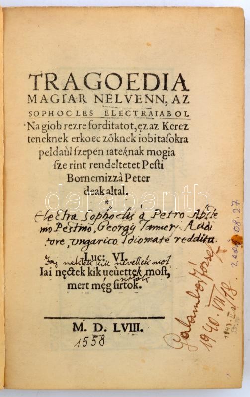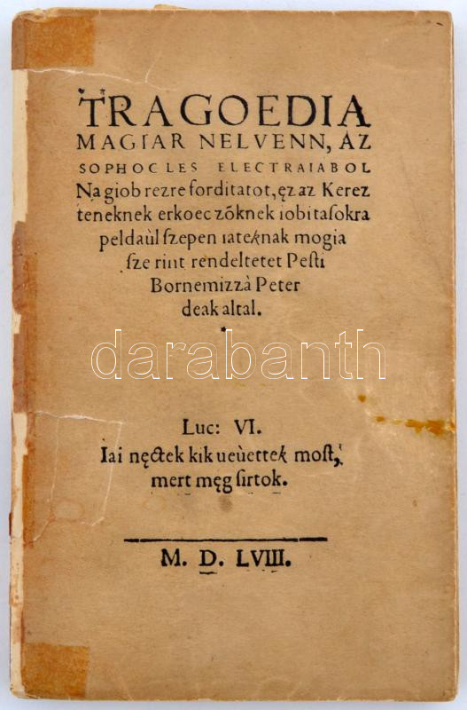 Bornemisza Péter: Tragoedia magiar nelvenn, az Sophocles Electraiabol Nagiob rezre forditatot, ez az Kerezteneknek erkoeczöknek iobitasokra peldaúl szepen jateknak mogia szerint rendeltetet Pesti Bornemizzá Peter deak altal. 1558. Hasonmás kiadás. Bp. 1923, Állami Térképészet. 68 lev., VII l. (utószó, melyet Ferenczi Zoltán írt). ,,Ezt a művet felfedezte dr. Krüger Herman Anders úr Gothában, sajtó alá rendezte Ferenczi Zoltán, kiadta Rényi Károly fotolitografiában merített papírra, nyomtatta 300 számozott és aláírt példányban a m. k. Állami Térképészet." 299. számú, aláírt példány. Kiadói papírborítóban, pótolt gerinccel.