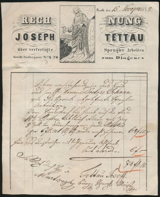 Beschreibung: 1848 Pest, Joseph Tettau bádogos által kiállított fejléces számla