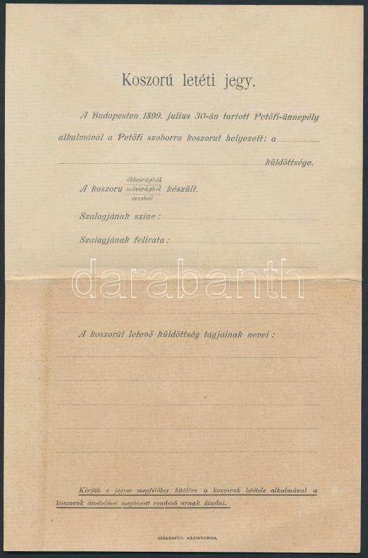 1899 Bp., Koszorú letéti jegy a Petőfi szoborra helyezendő koszorúhoz https://www.darabanth.com/de/255-Fernauktion/255.0/Andere-Sammelgebiete/Dokument~600015/1899-Bp-Koszoru-leteti-jegy-a-Petofi-szoborra-helyezendo-koszoruhoz~II1250202