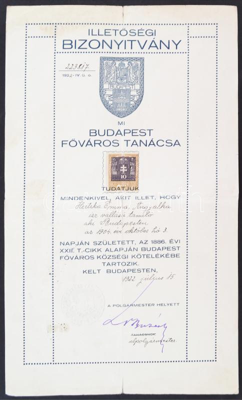 Beschreibung: 1922 Bp., Budapesti Főváros Tanácsa által kiállított illetőségi bizonyítvány, illetékbélyeggel