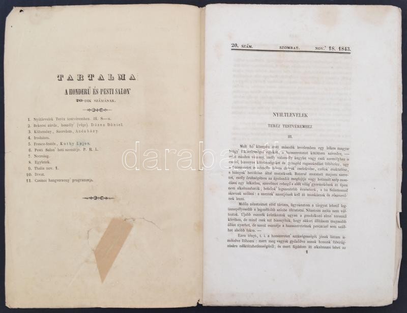 1843 Honderü és pesti szalon. 20. szám, Első év II. fele, (Szépirodal... https://www.darabanth.com/de/255-Fernauktion/255.0/Andere-Sammelgebiete/Drucksachen~600029/1843-Honderu-es-pesti-szalon-20-szam-Elso-ev-II-fele--Szepirodalmi-muveszeti-es-diva~II1241539