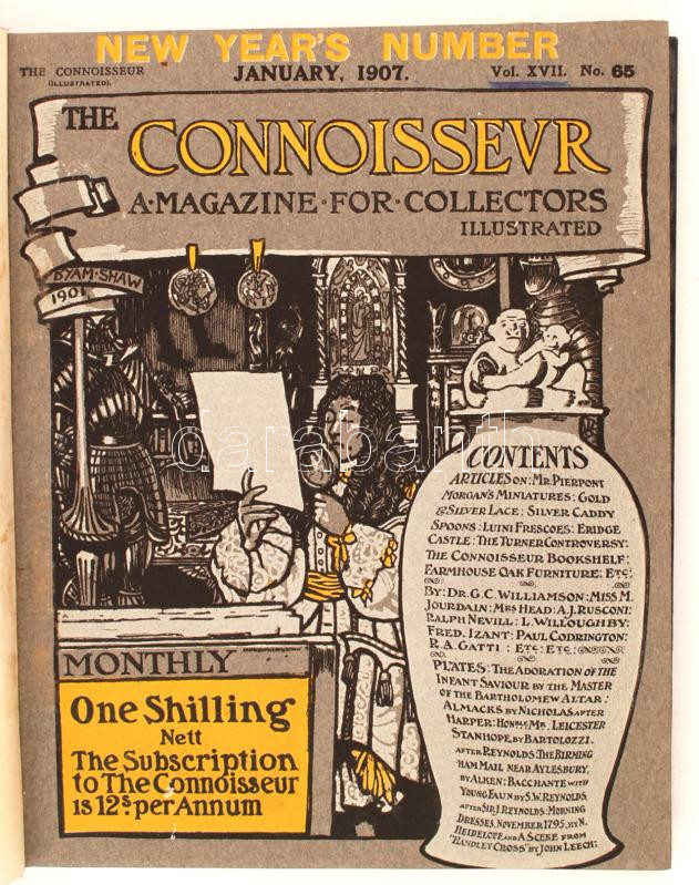 1907 The Conoisseur. A Magazine for Collectors Illustrated. 17. évf. 65. sz., angol gyűjtői magazin újévi lapszáma, benne számos érdekességgel. Foltos vászonkötésben, egyébként jó állapotban.