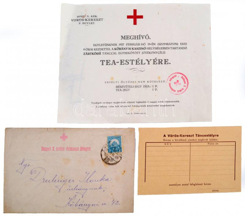 Beschreibung: 1927 Meghívó a Vöröskereszt kőbányai egyletének tea estélyre, hozzá boríték és levelezőlap
