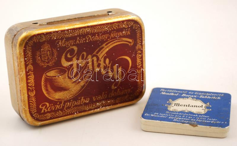 2 db régi fém dobozka: Gentry pipadohányos doboz, 10,5x7,5x3,5 és Ment... https://www.darabanth.com/de/255-Fernauktion/255.0/Andere-Sammelgebiete/Flohmarkt~600010/2-db-regi-fem-dobozka-Gentry-pipadohanyos-doboz-10-5x7-5x3-5-es-Mentanol-Borax-Tablettak-dob~II1243302